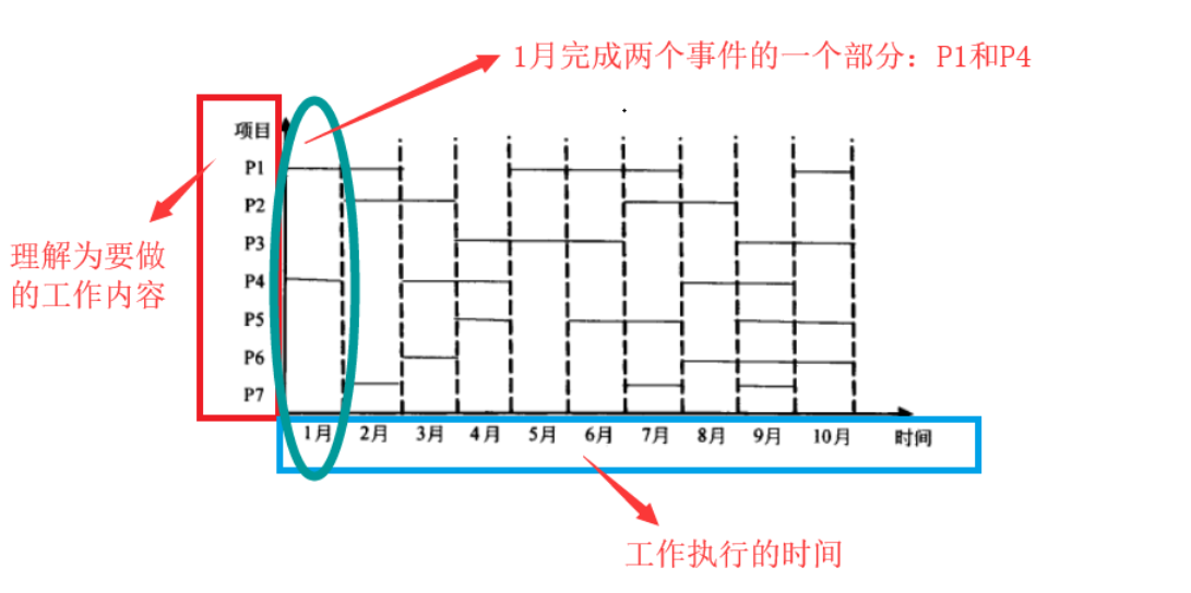 这道题这样来看:首先横轴是时间,表示从1月到10月,纵轴是具体的项目,从P1到P7,即图中表示的是每个月应完成的项目,或者说每个项目应完成的时间段。如图所示: