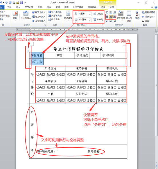 4) 利用表格工具的“布局”设置表格的行高和列宽,以及表格内容对齐方式(水平且垂直居中)。